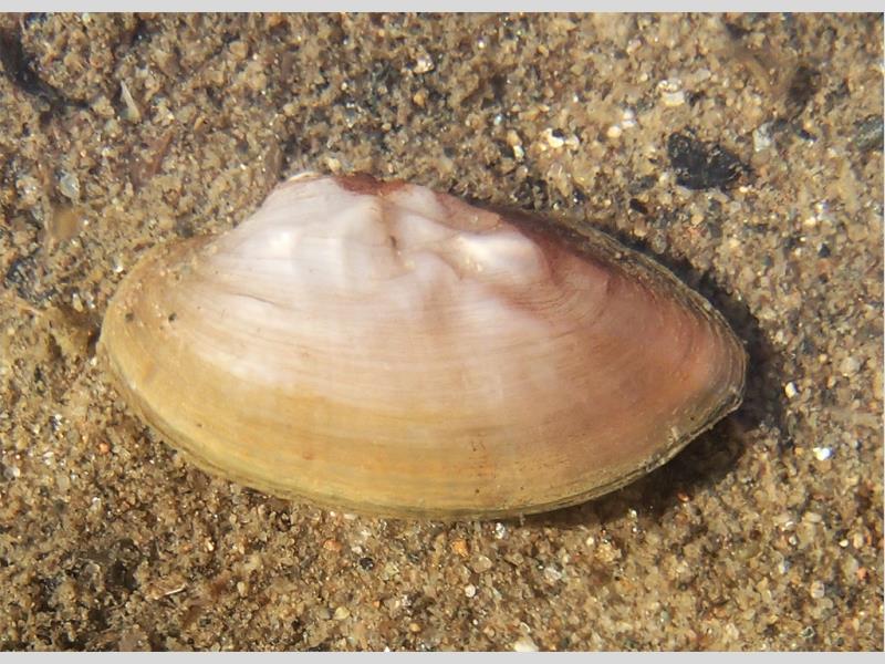 Lebendes Jungtier der Großen Flussmuschel ( Unio tumidus) in der Elbe bei Radebeul, Anfang Juli 2019 (Orginalgröße)