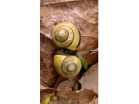 Hain-Schnirkelschnecke ( Cepaea nemoralis) mit Gemeiner Bernsteinschnecke, Leipzig Kanitzsch, April 2018 (Orginalgröße)