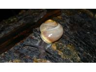 Garten-Schnirkelschnecke (Cepaea hortensis ), völlig pigmentfreies Tier: statt schwarz sind die Streifen transparent. Leipzig Ratsholz, Juni 2018 (Orginalgröße)